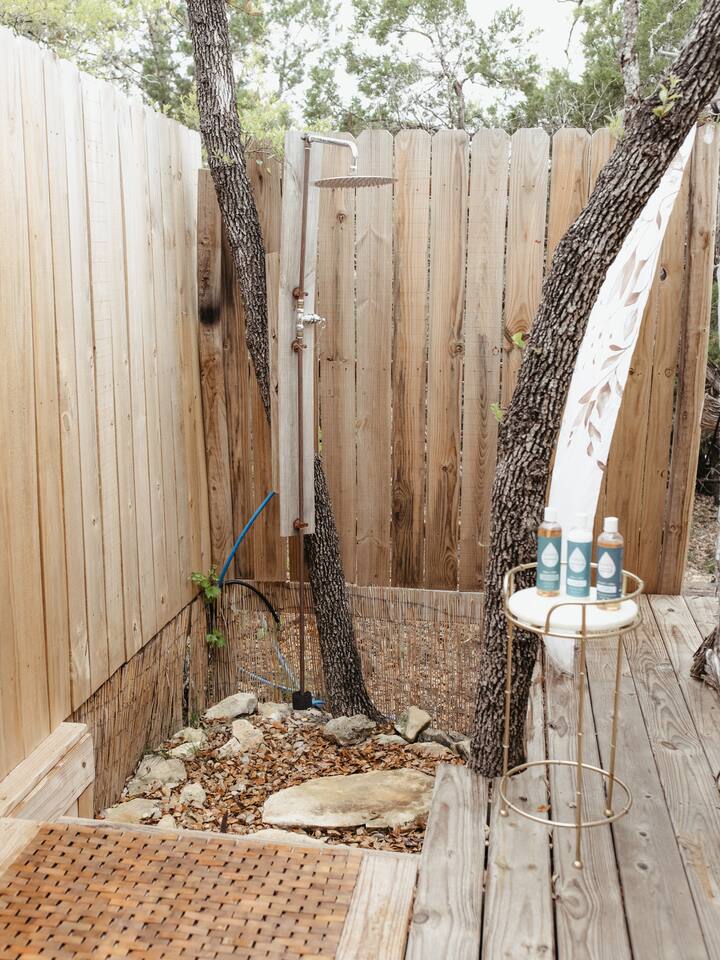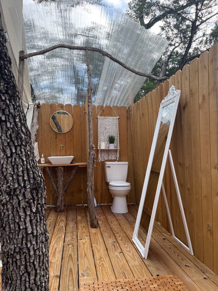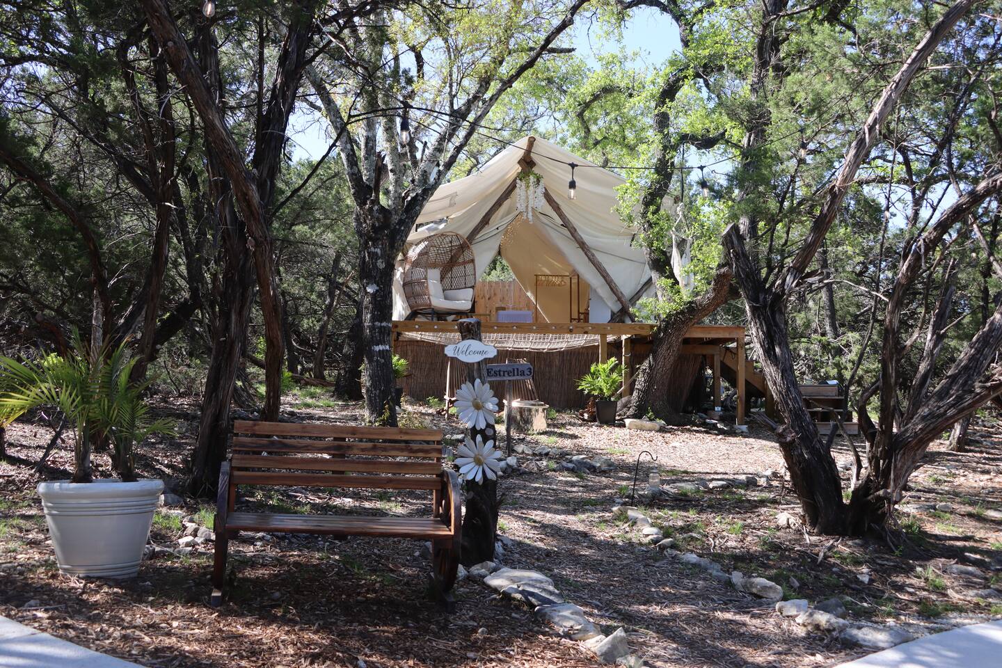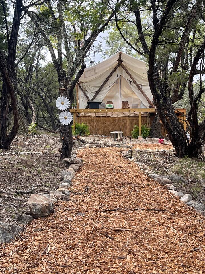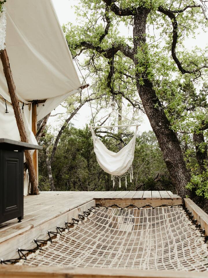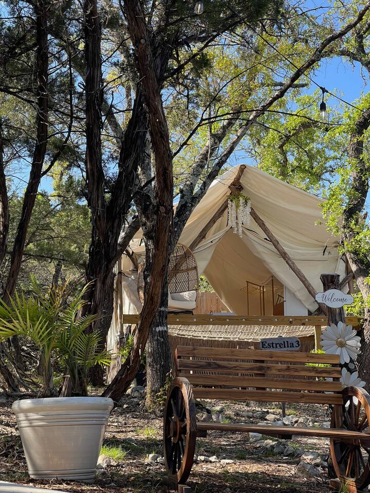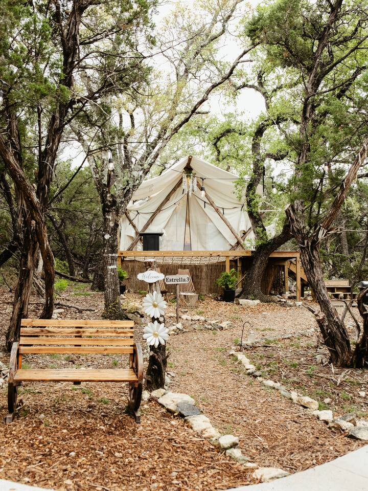 Reconnect with nature at these unforgettable glamping escapes. 3 tents available (Estrella1UnderStars, Estrella2UnderStars). Our hill country property is set on 11 acres of private, secluded land. Only miles from dining, shopping & Fiesta Texas, but far enough to feel like an outdoor paradise. Low light restrictions promote an elite stargazing experience. Amazing views, birdwatching, surrounded by trees & nestled in the valley of Cross Mountain Ranch. Private gated entry. Glamorous Camping…OMG!
