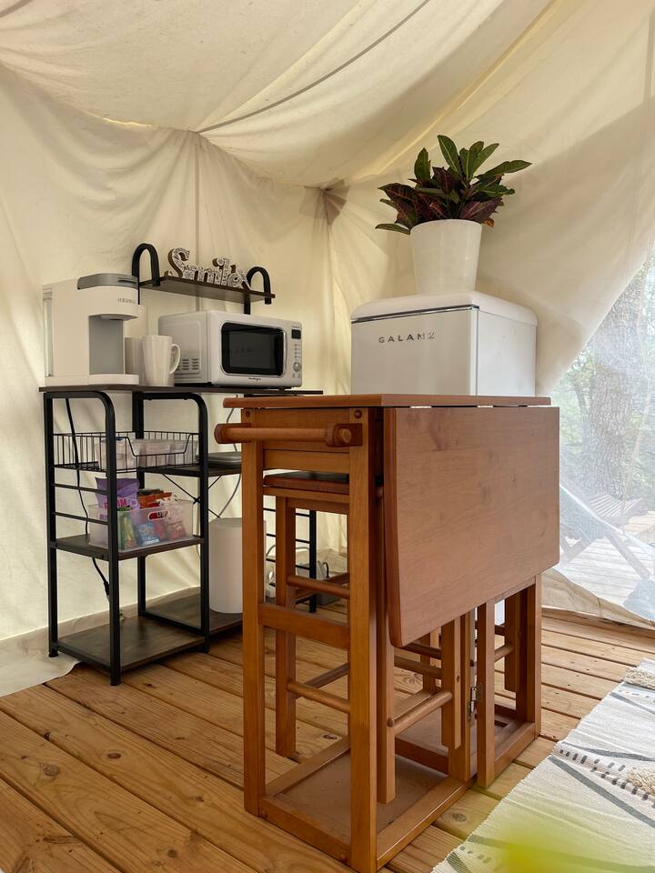 Estrella 3 was such a beautiful space and retreat. It truly did not feel like i was staying in a tent. The surroundings were great and Geneive was a gracious Host, making sure i had all i needed. The morning was especially nice, there was a light drizzle, w/the complimentary breakfast, having my hot tea and sitting on the deck taking in the view made it especially peaceful. Thank you for creating a space within reach , not too far away and making me feel right at home.